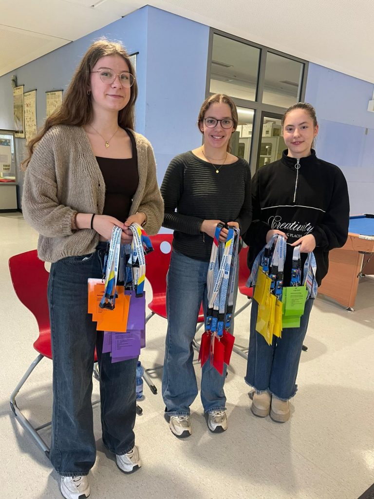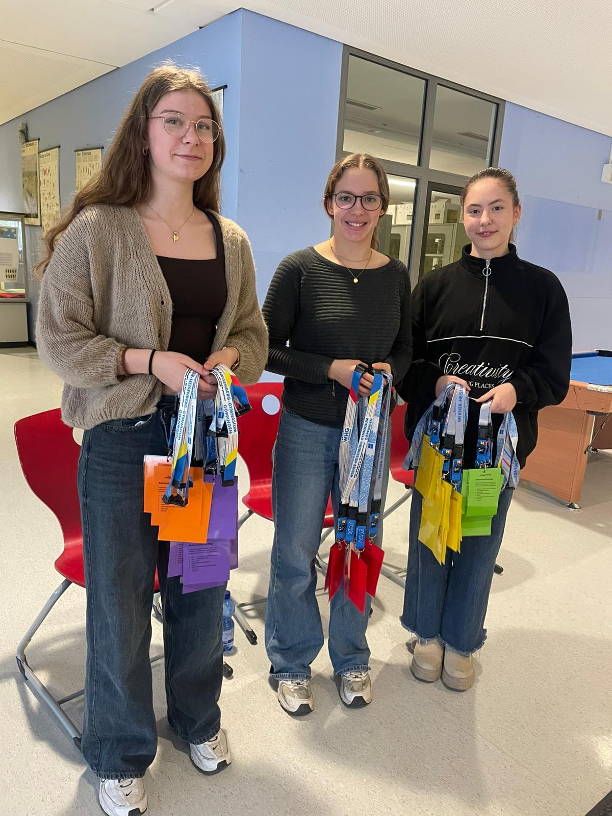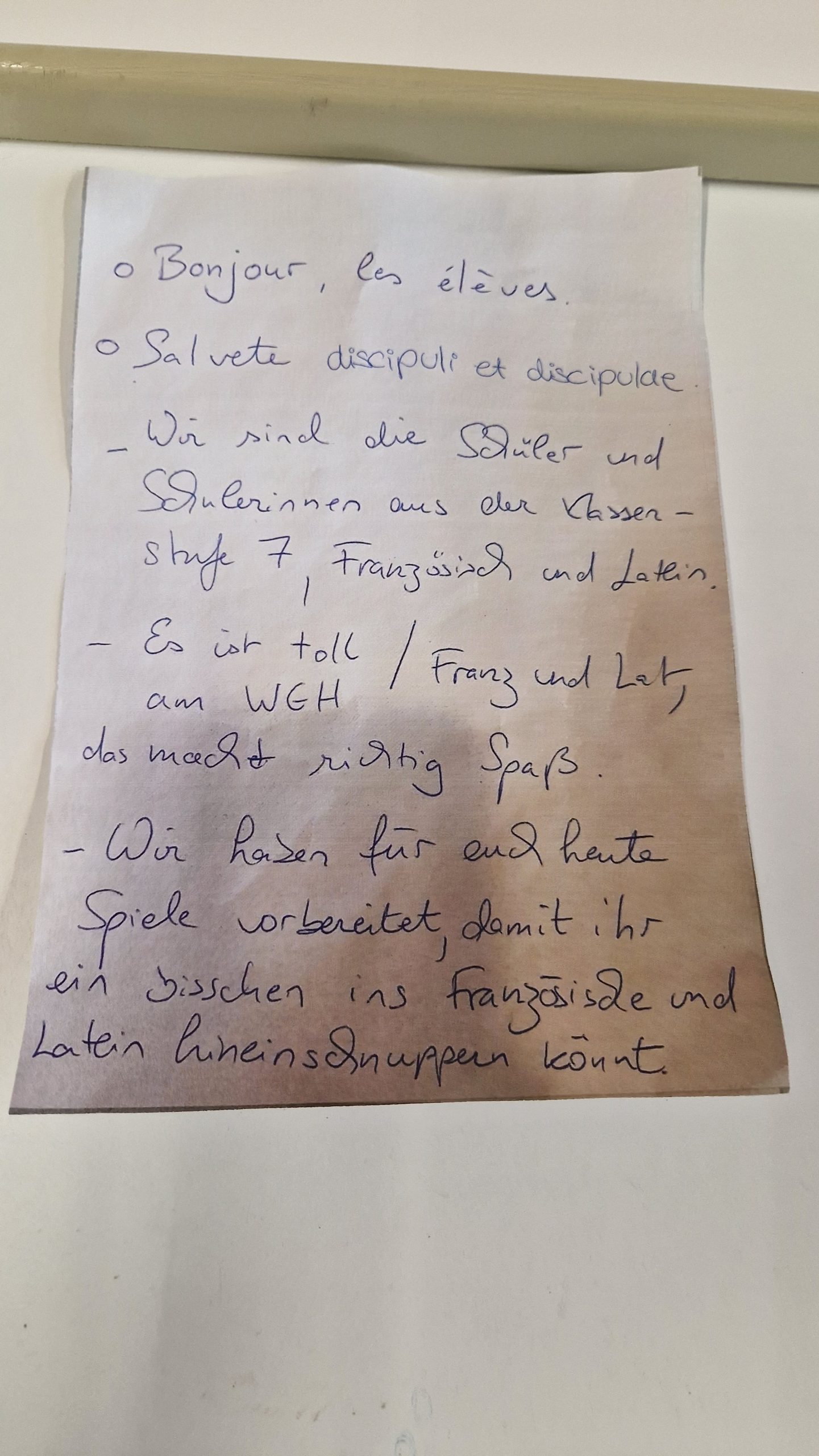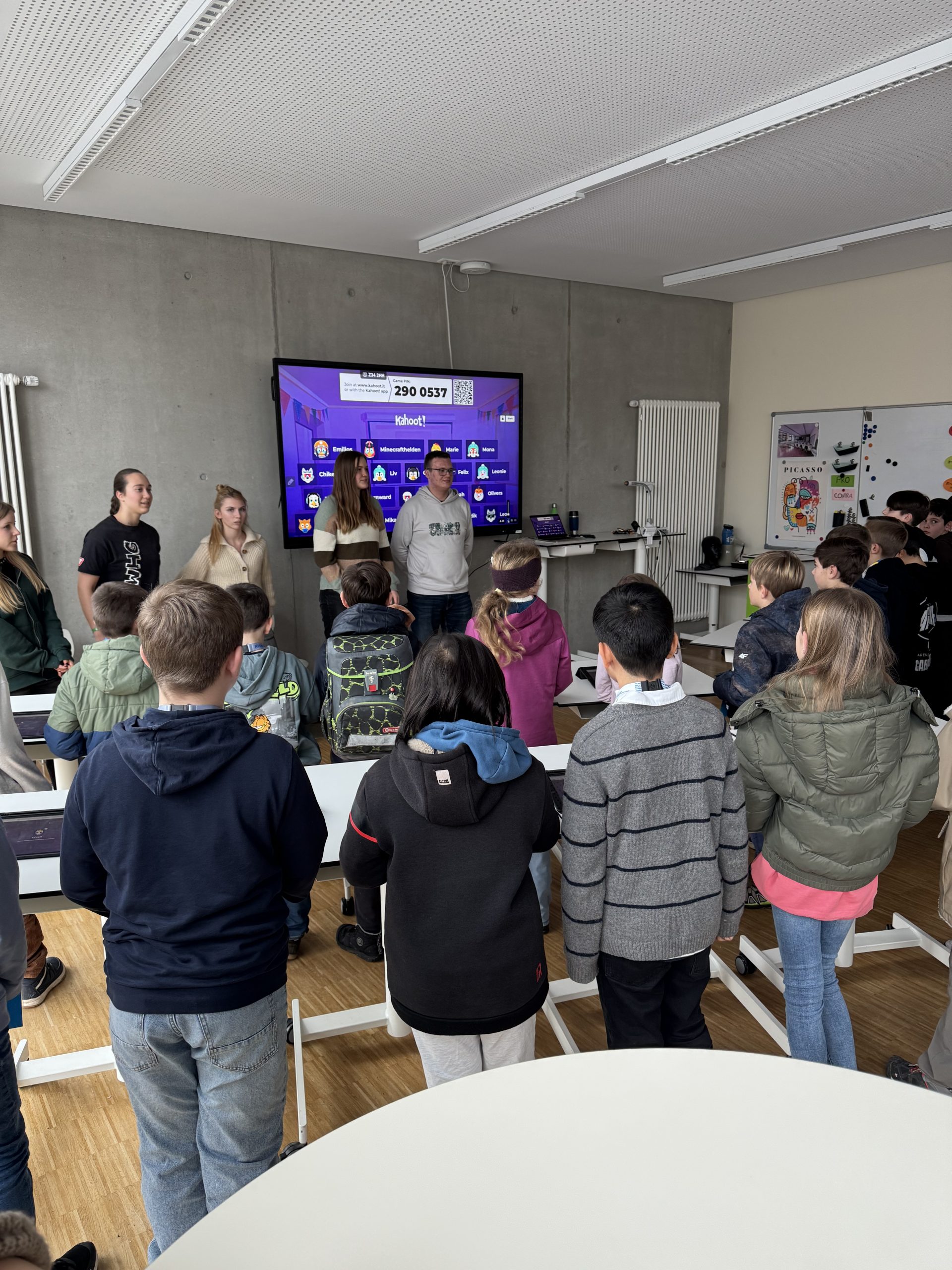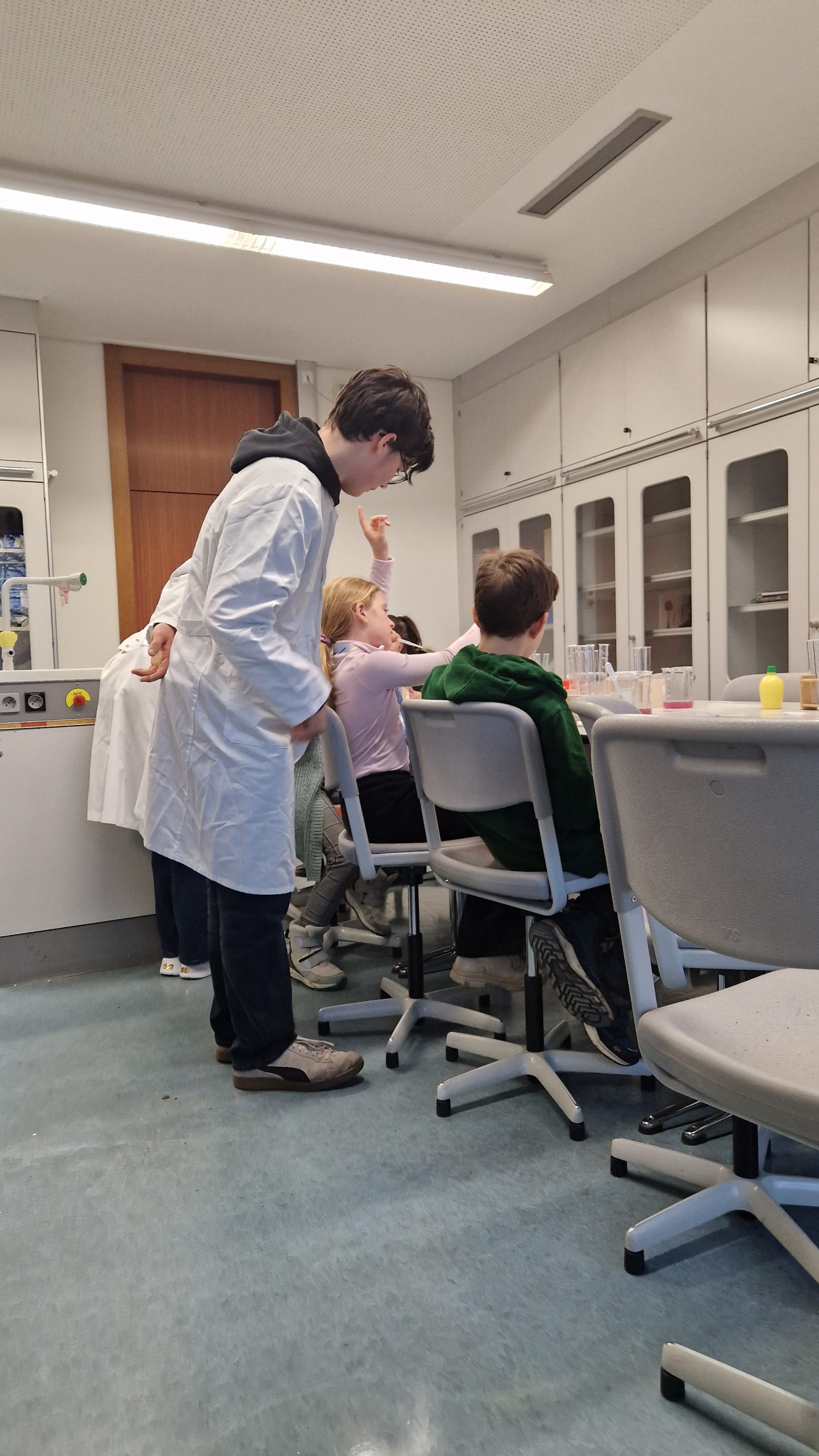 In Kleingruppen wurden unsere Gäste von Lehrkräften und engagierten Schülerinnen der zehnten und elften Klassen durch das Schulhaus begleitet. An jeder Station gab es etwas zu entdecken: In der Turnhalle wartete ein sportlicher Mini-Parcours mit Urkunde, an den Sprachenstationen präsentierten sich Englisch, Französisch, Latein und Spanisch auf kreative Weise. Die Naturwissenschaften luden ein zum Mikroskopieren, Staunen über chemische Reaktionen und Beobachten kleiner Roboterfahrzeuge. Für Begeisterung sorgte wie immer der Bonbon-Roboter von Herrn Schuhmeier in der Informatik – direkt neben dem Politik-Quiz des Gemeinschaftskunde-Leistungskurses. Wer sich für das Ganztagesangebot, Förderangebote, AGs und Profile interessierte, konnte sich an der Infostation der Schulleitung umfassend informieren. Auch die Schulsozialarbeit war mit einem eigenen Stand vertreten. Ein gemütlicher Abschluss wartete in der Mensa, wo die Jahrgangsstufe 2 Kaffee und Kuchen für die Abikasse verkaufte. Zudem stellten sich das Schulmagazin Guckloch sowie das Projekt Patenkind vor.