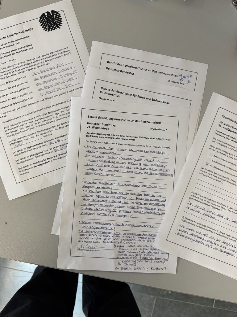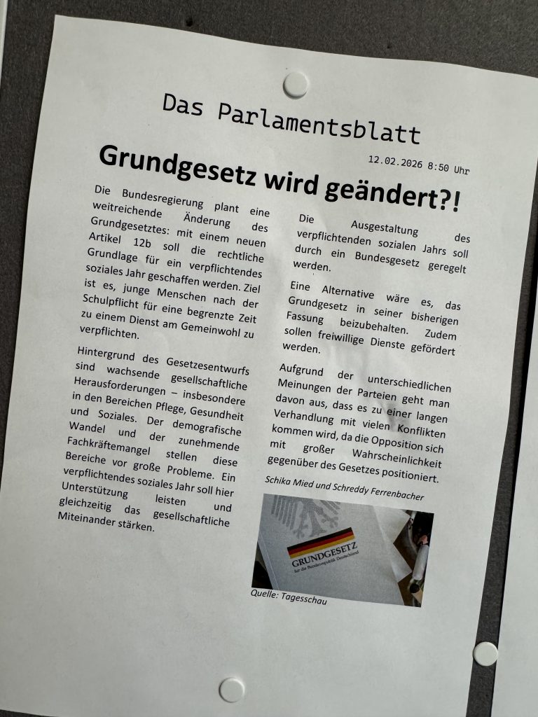 Im Zentrum des Planspiels stand ein hochaktueller und kontroverser Gesetzesentwurf zur Einführung eines verpflichtenden sozialen Jahres. Konkret sollte nach Artikel 12a ein neuer Artikel 12b ins Grundgesetz eingefügt werden, der vorsieht, dass Männer und Frauen nach Beendigung der Schulpflicht für eine begrenzte Zeit einen sozialen Dienst am Gemeinwohl leisten können – insbesondere in den Bereichen Pflege, Gesundheit, Soziales oder vergleichbaren gemeinwohlorientierten Tätigkeiten. Gleichzeitig wurde festgeschrieben, dass Dauer, Ausgestaltung, soziale Absicherung, Vergütung sowie Ausnahmen durch ein Bundesgesetz geregelt werden und der soziale Dienst nicht zur dauerhaften Ersetzung regulärer Beschäftigung dienen darf.