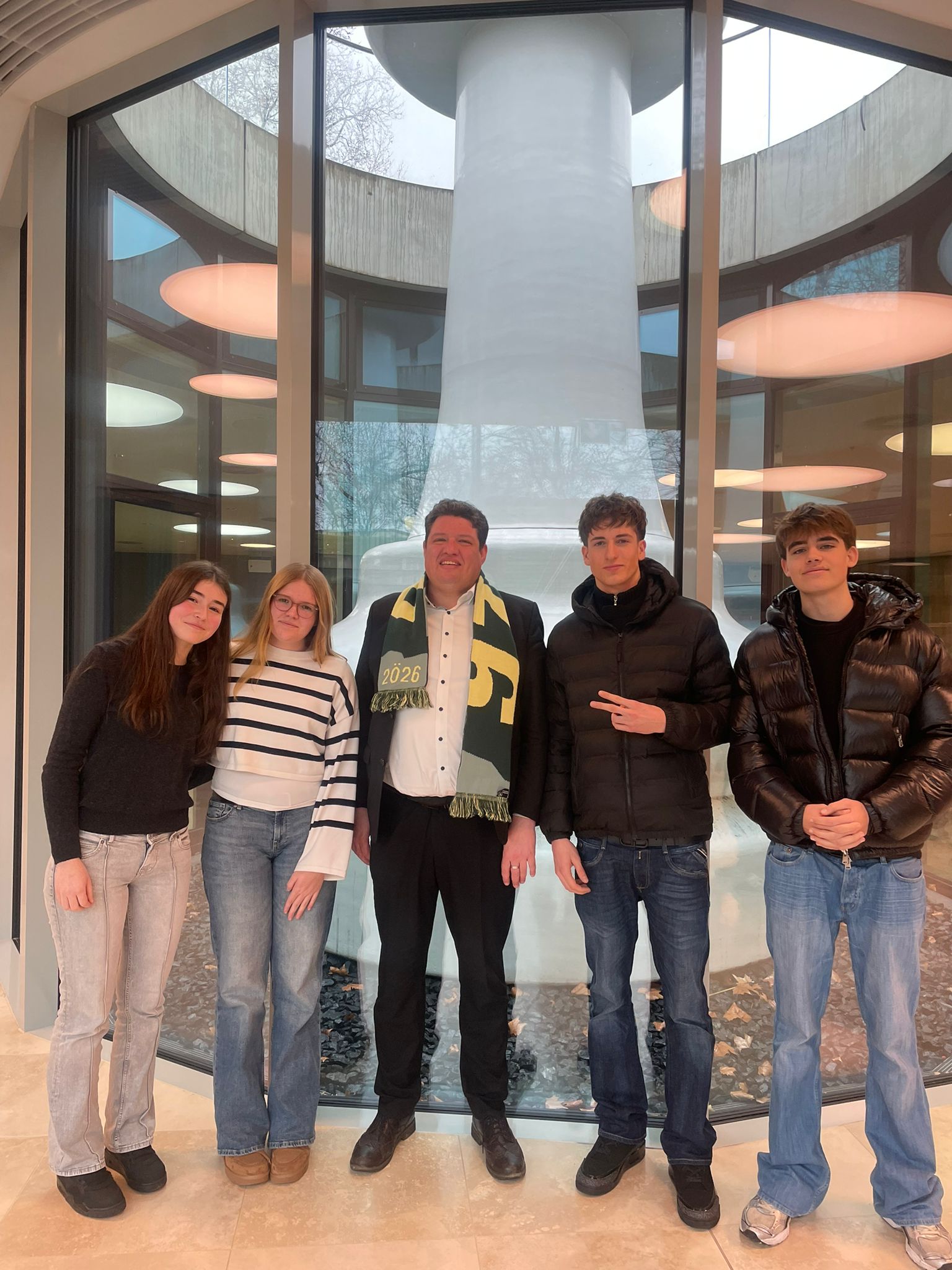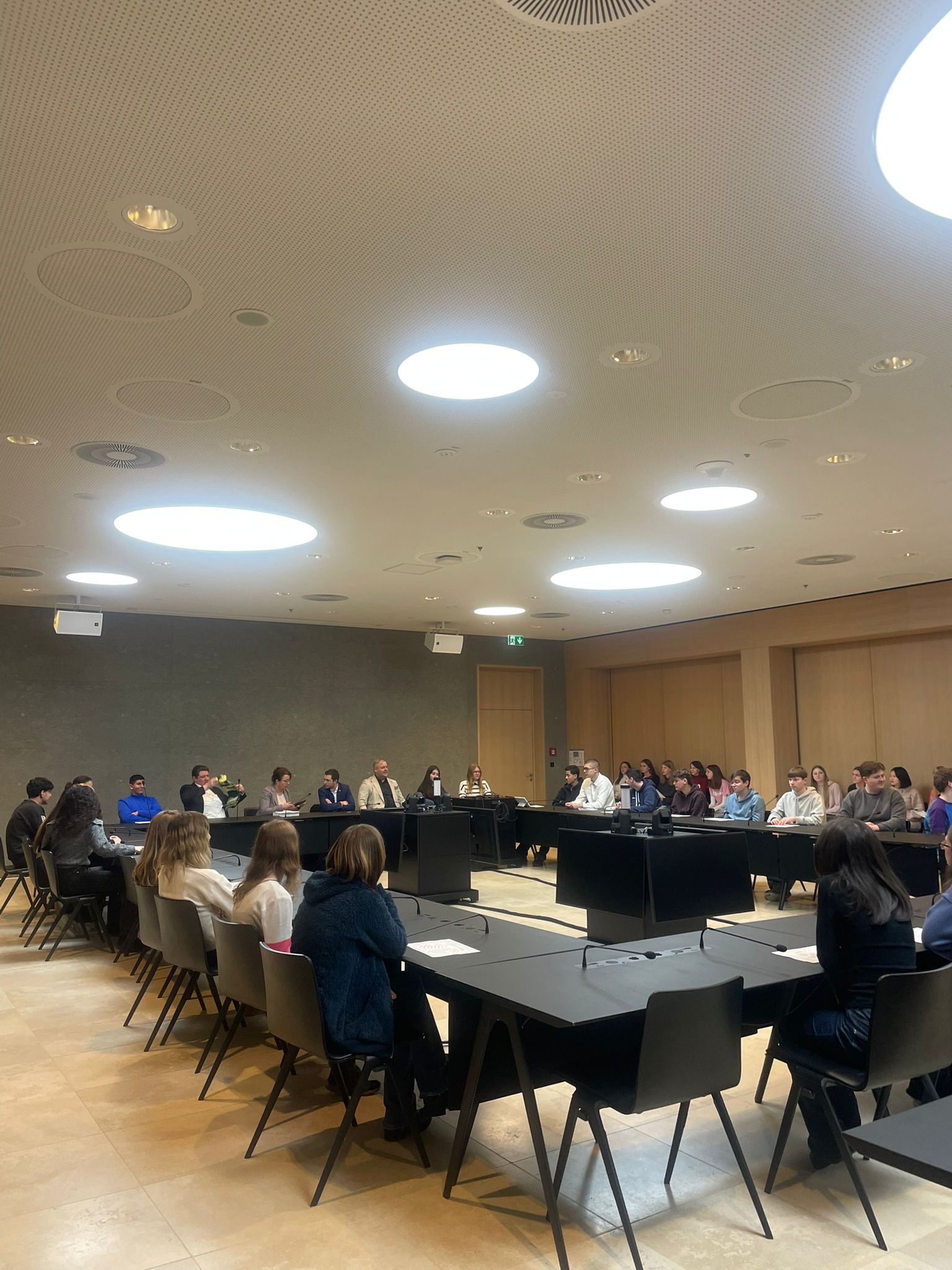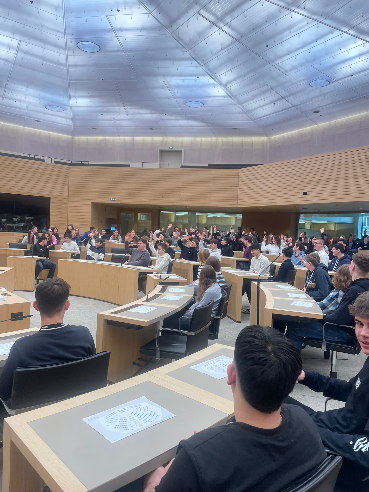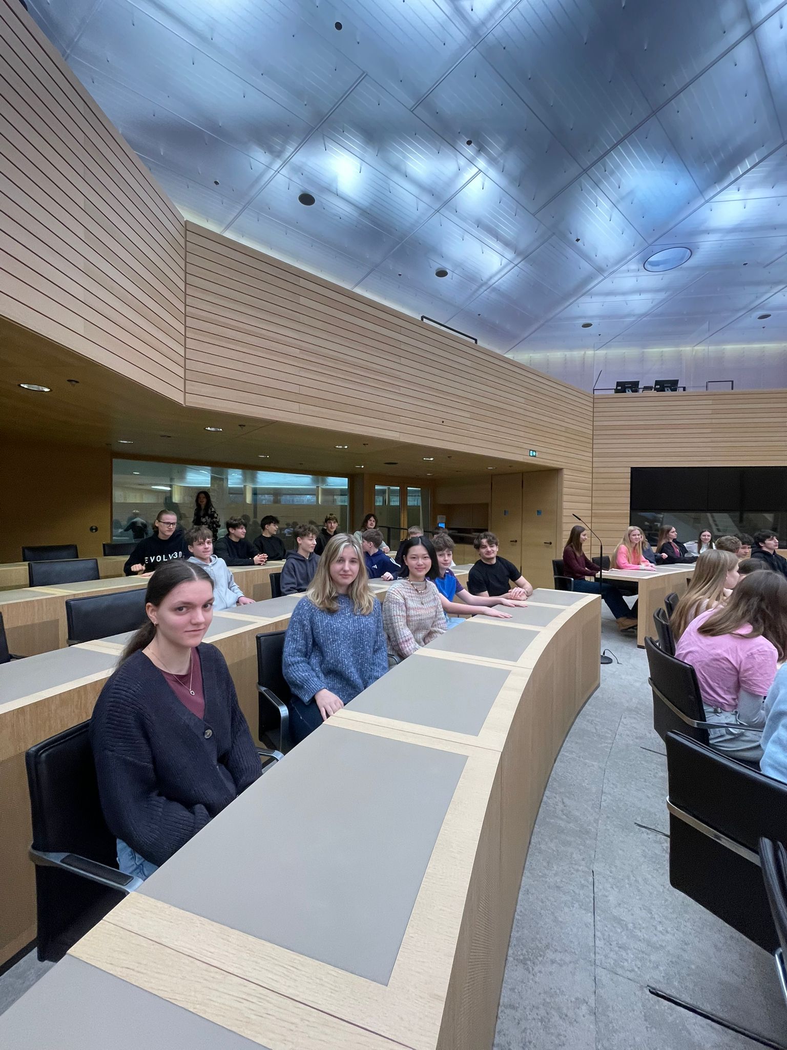 Am 29. Januar 2026 besuchten die zehnten Klassen des WHG gemeinsam mit Frau Härtel, Frau Katz und Herrn Dis den baden-württembergischen Landtag in Stuttgart. Im Rahmen des Besuchsprogramms konnten die Schüler:innen nicht nur den Plenarsaal von innen sehen, sondern selbst in die Rolle von Landtagsabgeordneten schlüpfen: Bei einem Planspiel wurde ein Ministerpräsident gewählt, ein:e Landtagspräsident:in bestimmt und das parlamentarische Verfahren interaktiv durchlaufen – inklusive Fraktionsbildung und Redezeiten. Besonders beliebt: die bequemen Ledersessel der Abgeordneten.