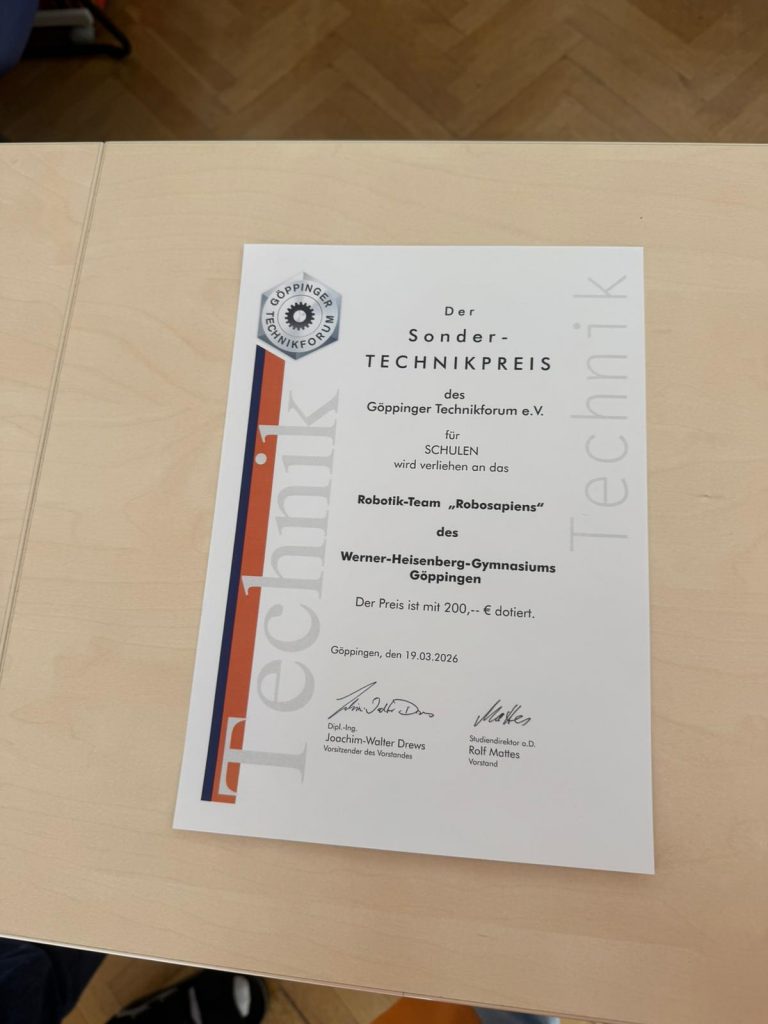 Große Anerkennung für unser Robotik-Team „Robosapiens“: Das Göppinger Technikforum hat das Team des WHG mit einem Sonder-Technikpreis in Höhe von 200 Euro ausgezeichnet. Die Unterstützung ist gezielt für die anstehende Teilnahme an der Robotik-Weltmeisterschaft Ende April in St. Louis (USA) gedacht. Ausgezeichnet wurde damit ein außergewöhnlicher Erfolg: Bei den deutschen VEX-Meisterschaften in Hamburg sicherten sich die Robosapiens den „Excellence Award“ – die höchste Auszeichnung des Wettbewerbs. Prämiert werden dabei nicht nur die technische Qualität des Roboters, sondern auch Teamarbeit, Strategie und Dokumentation. Mit diesem Erfolg qualifizierte sich das Team für das Weltfinale.